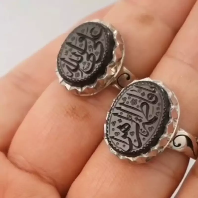 زوج عقیق جزع یمنی با حکاکی دستی و رکاب دست ساز سفارشی مدل صفوی