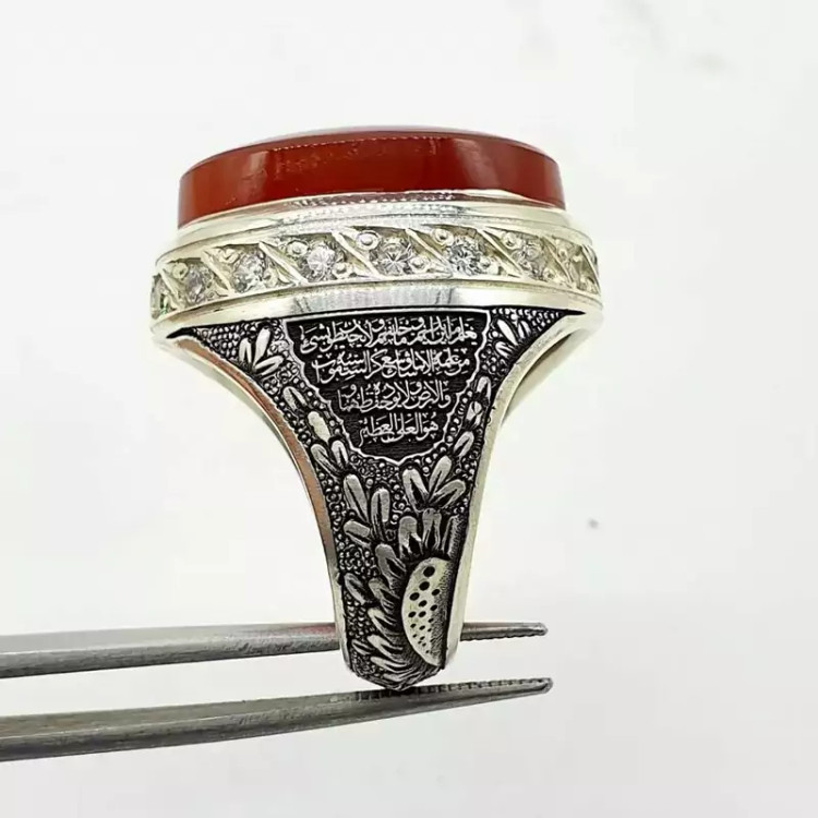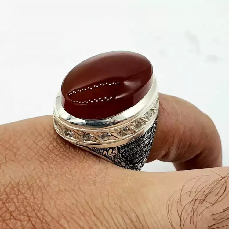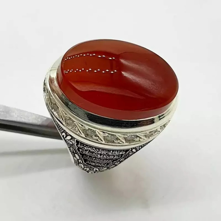 انگشتر عقیق یمنی سرخ اعلا با رکاب دست ساز سفارشی دور برلیان