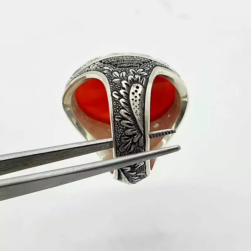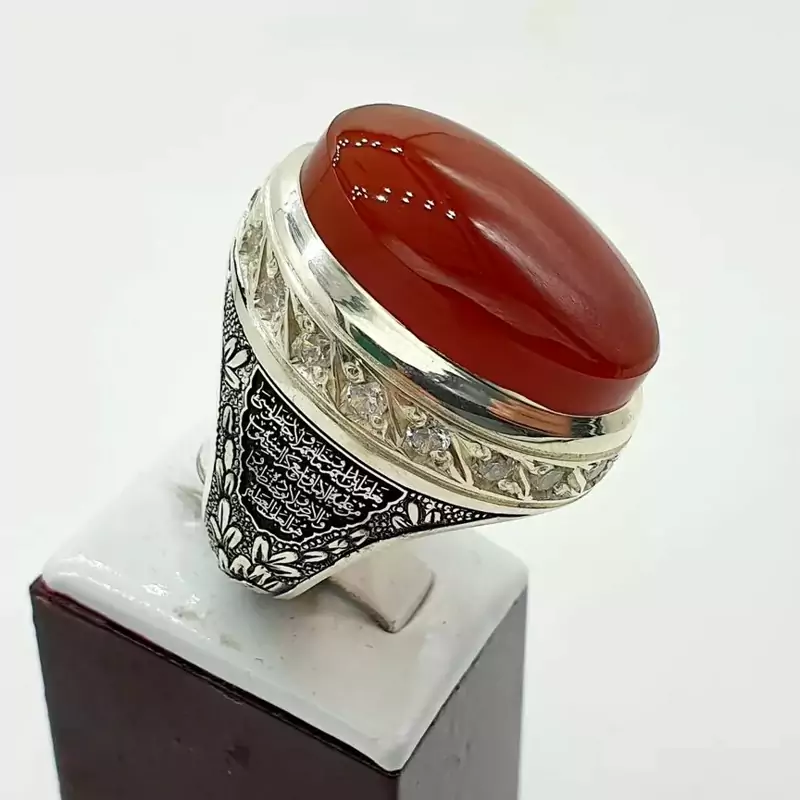 انگشتر عقیق یمنی سرخ اعلا با رکاب دست ساز سفارشی دور برلیان