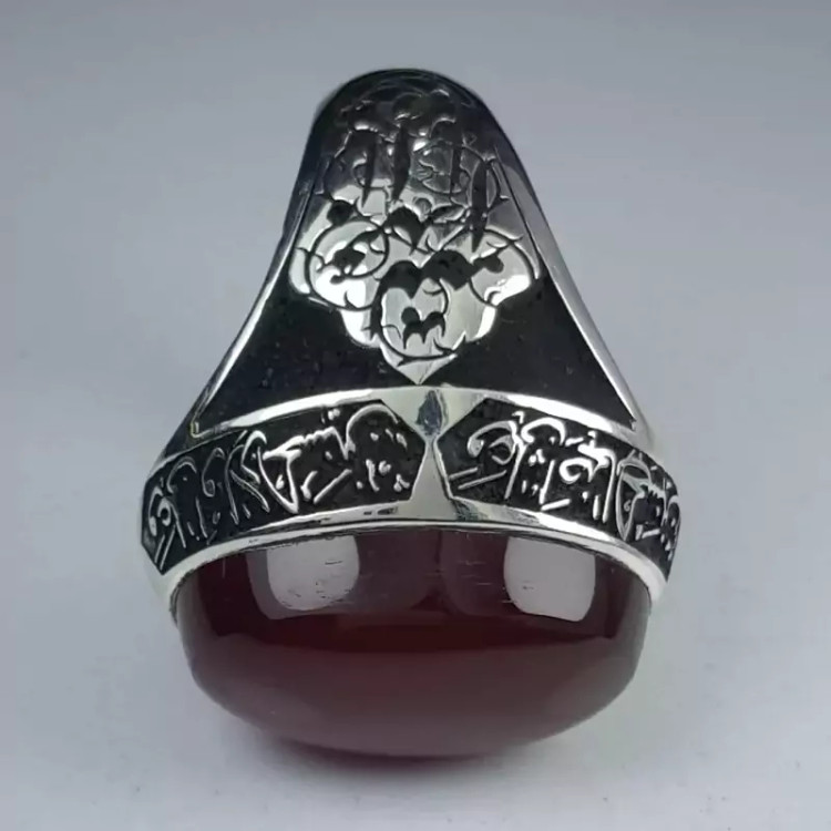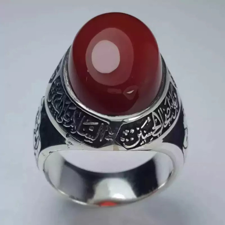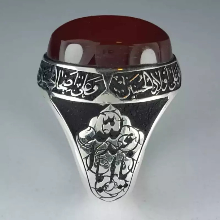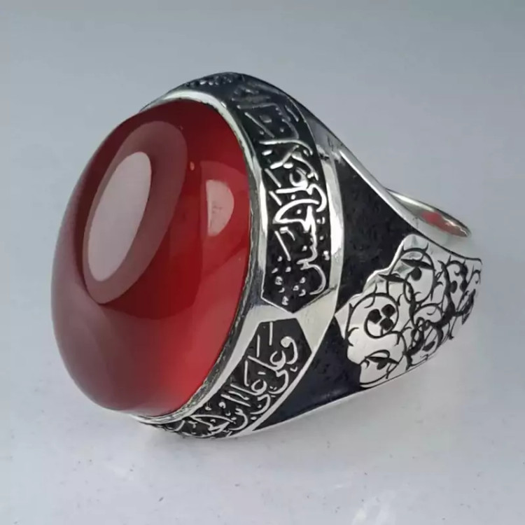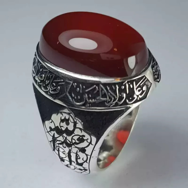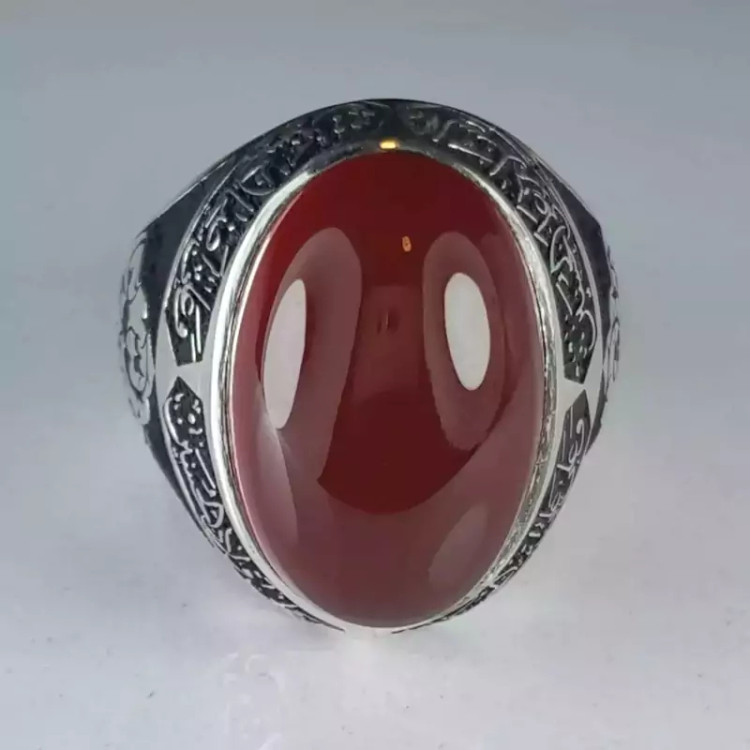 انگشتر عقیق معدنی سرخ اعلا با کیفیت بی نظیر و رکاب دست ساز سفارشی قلمکاری شده عیار بالا