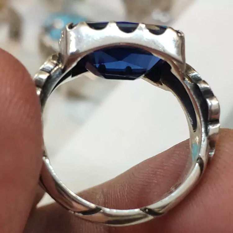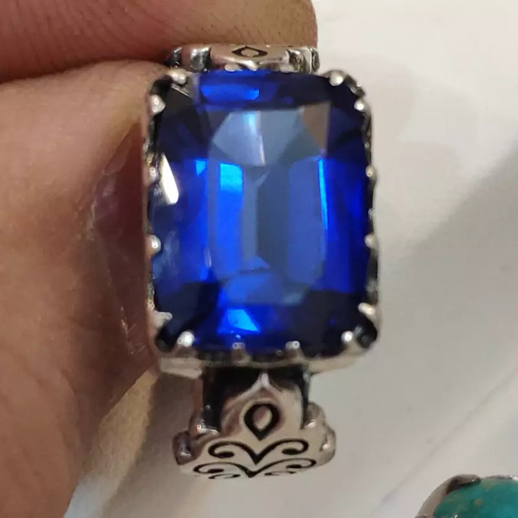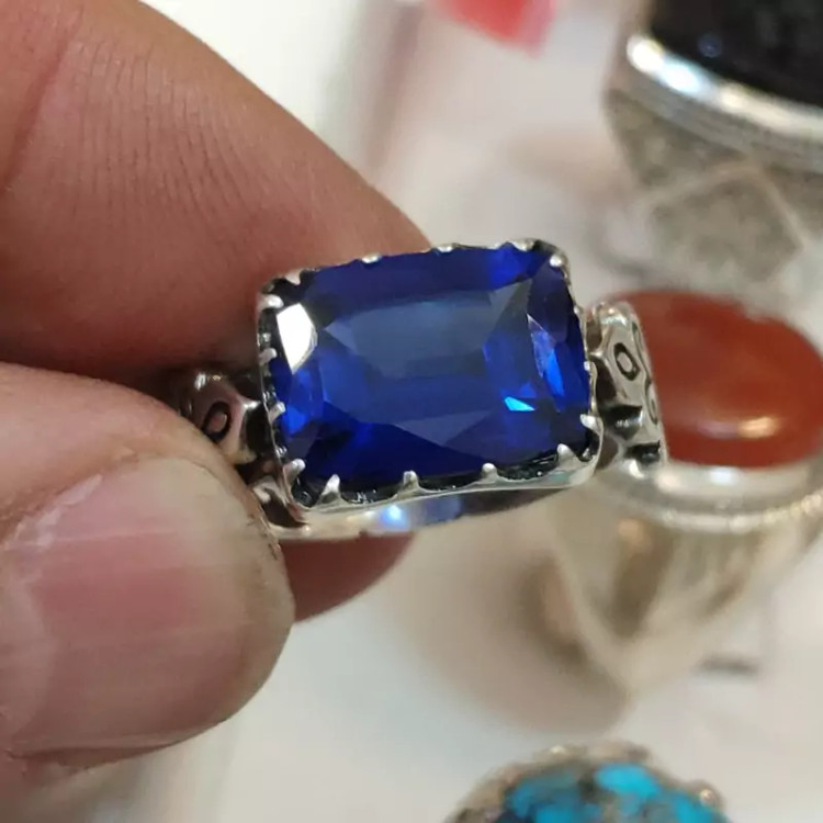 انگشتر یاقوت کبود سنتتیک فوق العاده زیبا و جذاب با رکاب نقره عیار بالا 925
