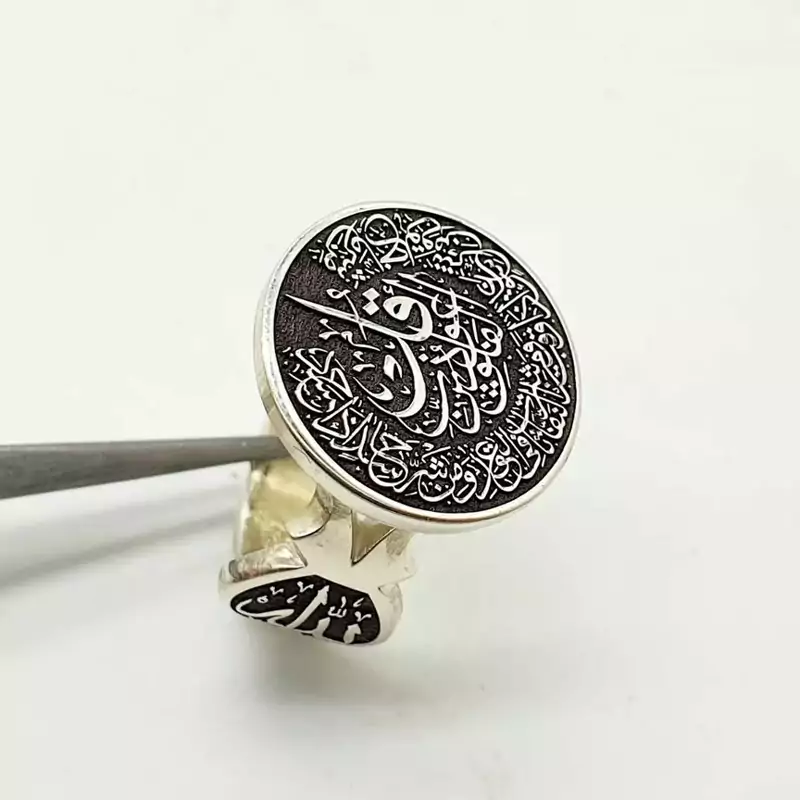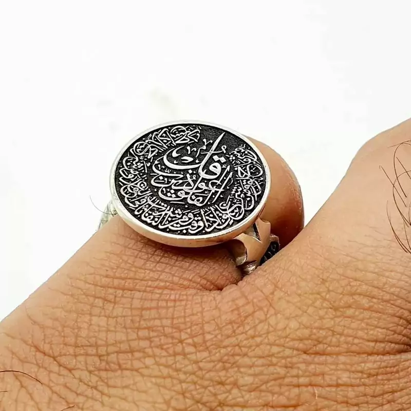 انگشتر تمام نقره سیاه قلم با قلمکاری فوق العاده زیبا ، دقیق و منظم سوره مبارکه فلق