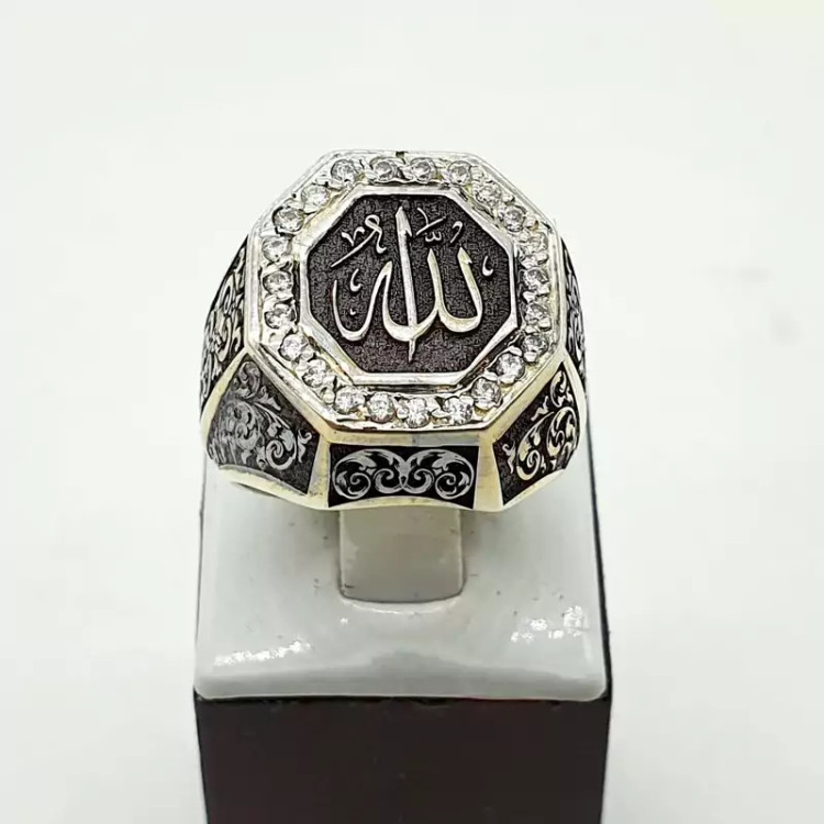 انگشتر تمام نقره عیار بالا با ذکر حکاکی شده الله با رکاب دست ساز سفارشی و قلمکاری بسیار ظریف و با دقت بر روی رکاب