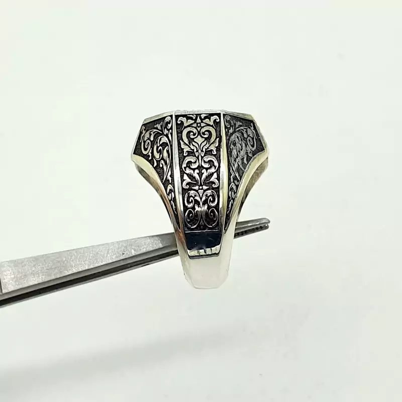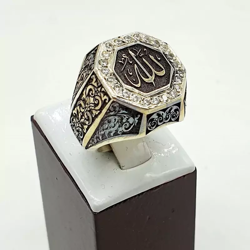 انگشتر تمام نقره عیار بالا با ذکر حکاکی شده الله با رکاب دست ساز سفارشی و قلمکاری بسیار ظریف و با دقت بر روی رکاب