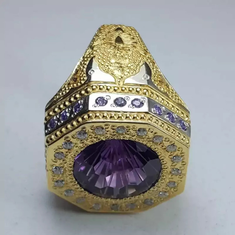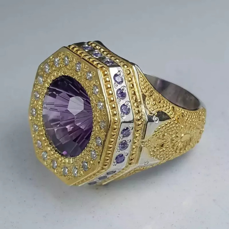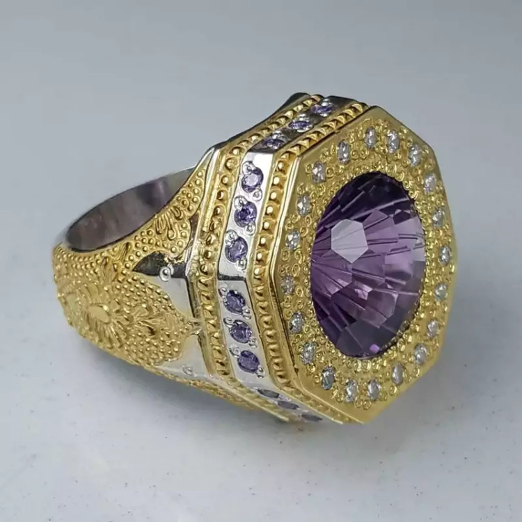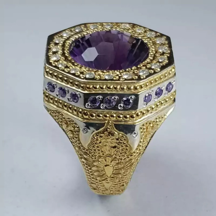 انگشتر آماتیست سلطنتی با رکاب دست ساز سفارشی و مخراجکاری شده با توپاز آبی