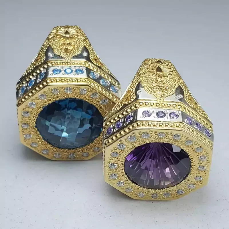 انگشتر آماتیست سلطنتی با رکاب دست ساز سفارشی و مخراجکاری شده با توپاز آبی
