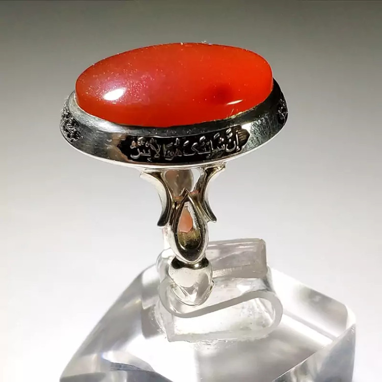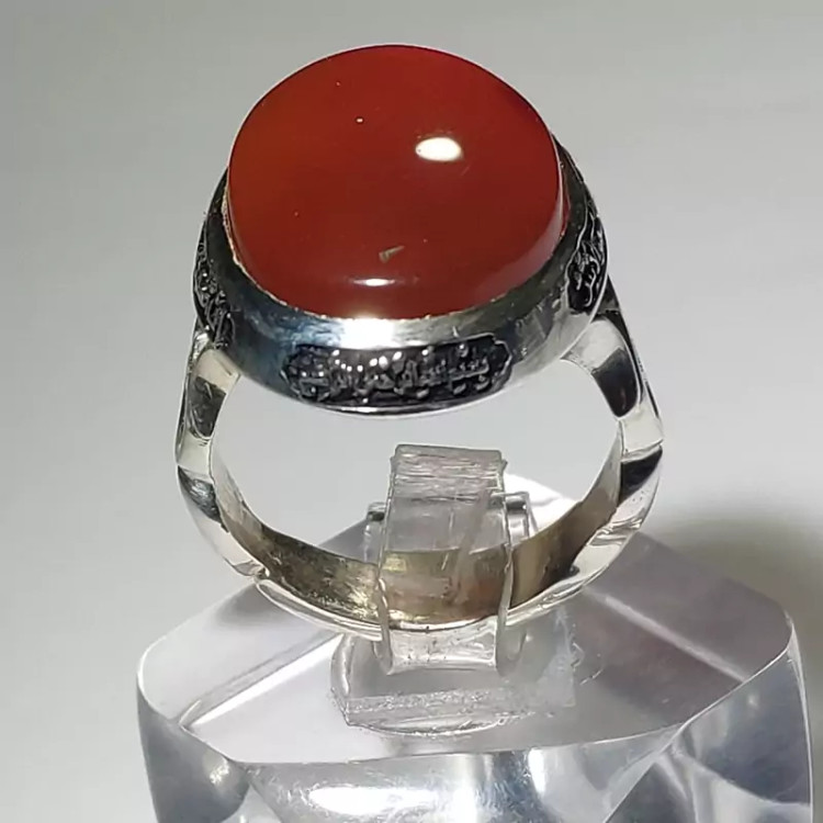 انگشتر عقیق یمنی سرخ اعلا و اصیل با رکاب حکاکی شده سوره مبارکه کوثر