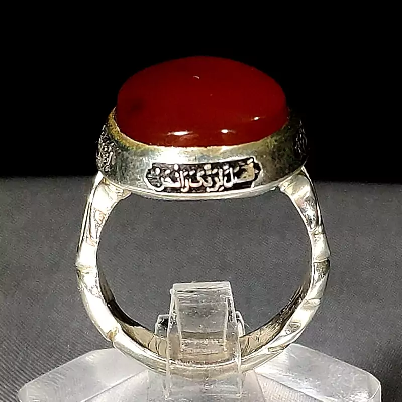 انگشتر عقیق یمنی سرخ اعلا و اصیل با رکاب حکاکی شده سوره مبارکه کوثر
