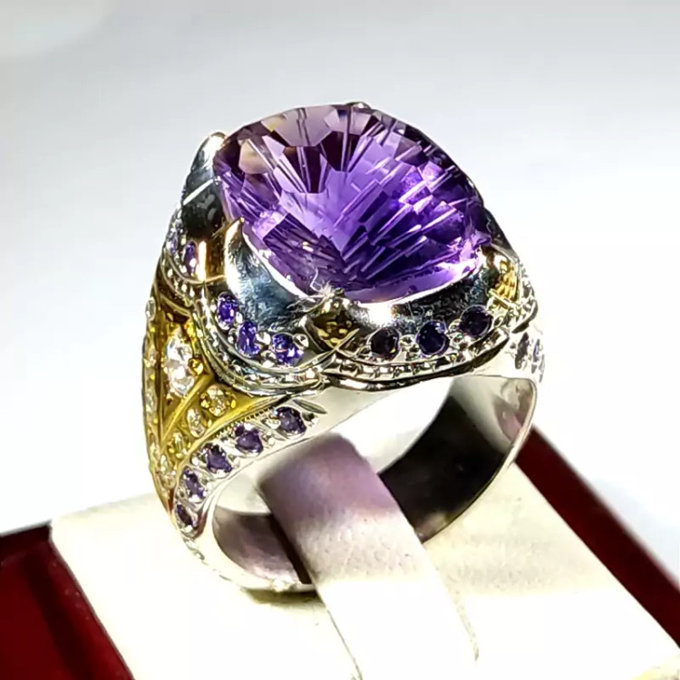 انگشتر آمیتیست فوق کلکسیونی با رکاب دست ساز سفارشی مخراجکاری شده با نگین های جواهری