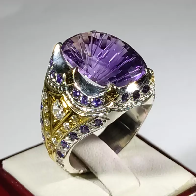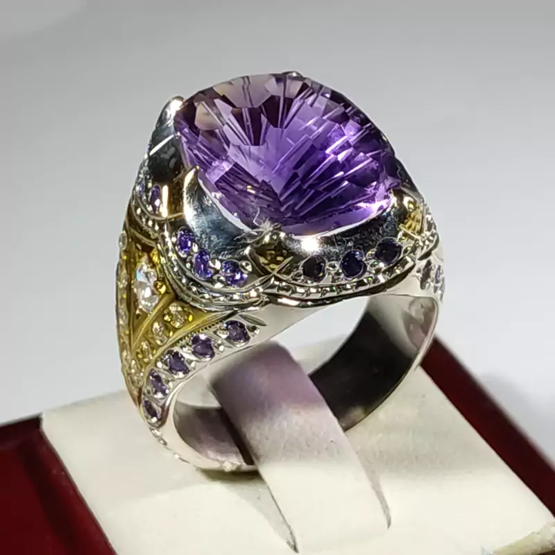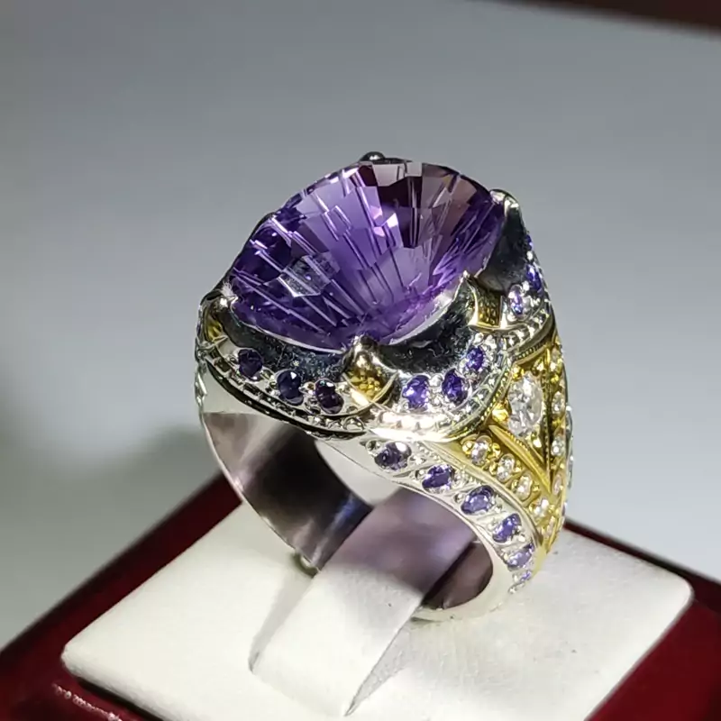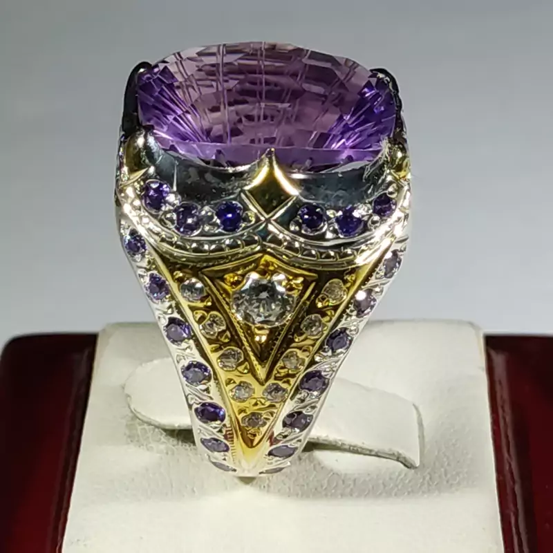 انگشتر آمیتیست فوق کلکسیونی با رکاب دست ساز سفارشی مخراجکاری شده با نگین های جواهری