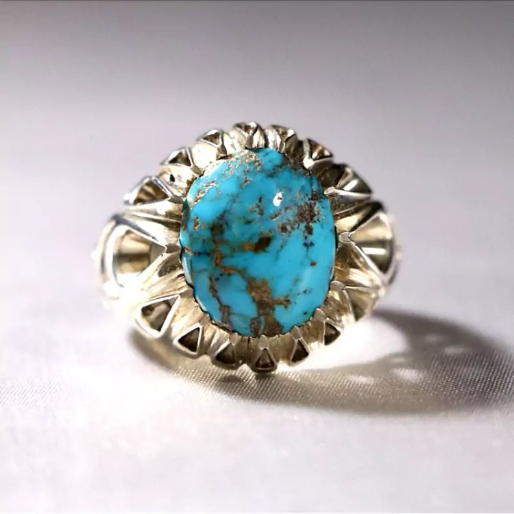 انگشتر فیروزه نیشابوری خوش رنگ با رکاب دست ساز مدل فیلی