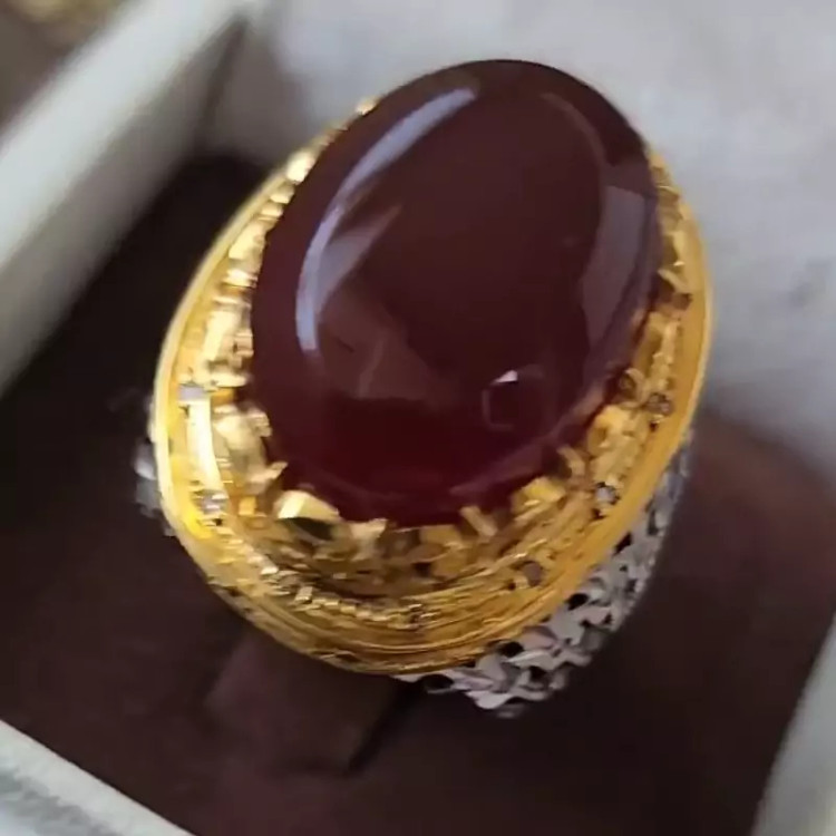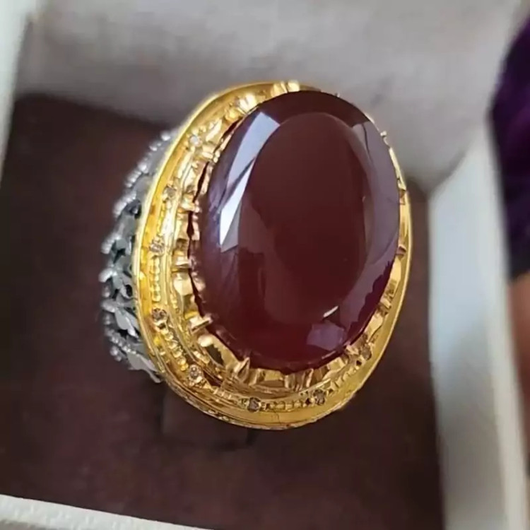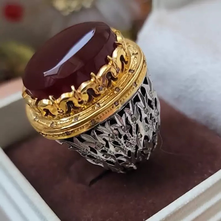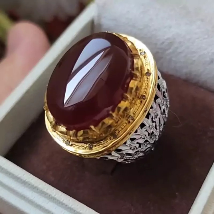 عقیق یمنی سرخ اعلا با رکاب دست ساز سفارشی و مخراجکاری شده با الماس طبیعی و درجه یک
