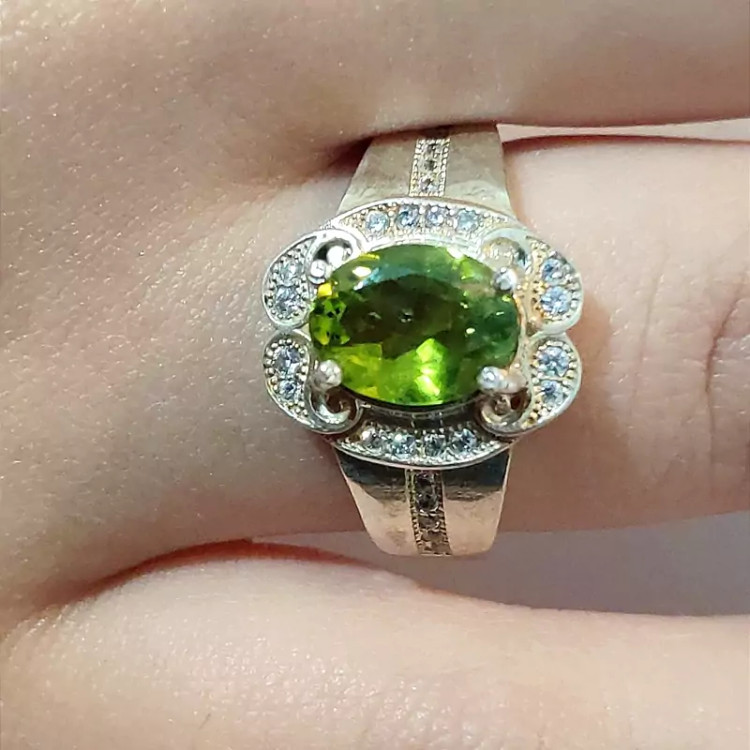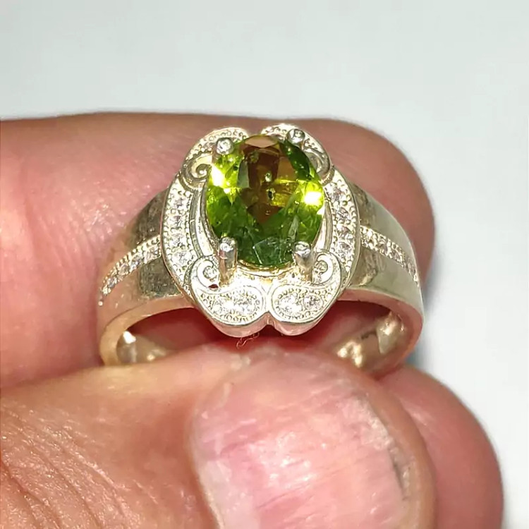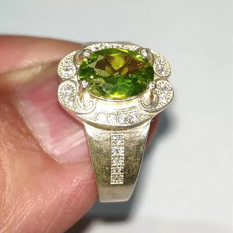 انگشتر زبرجد زنانه با رکاب نقره عیار بالا و مرصع شده با نگین های اتمی