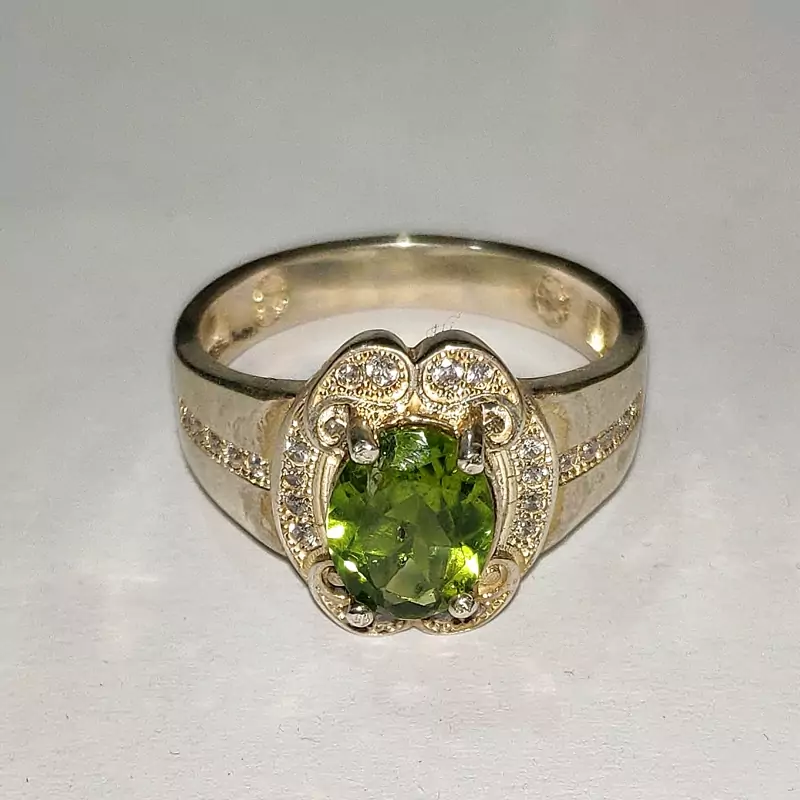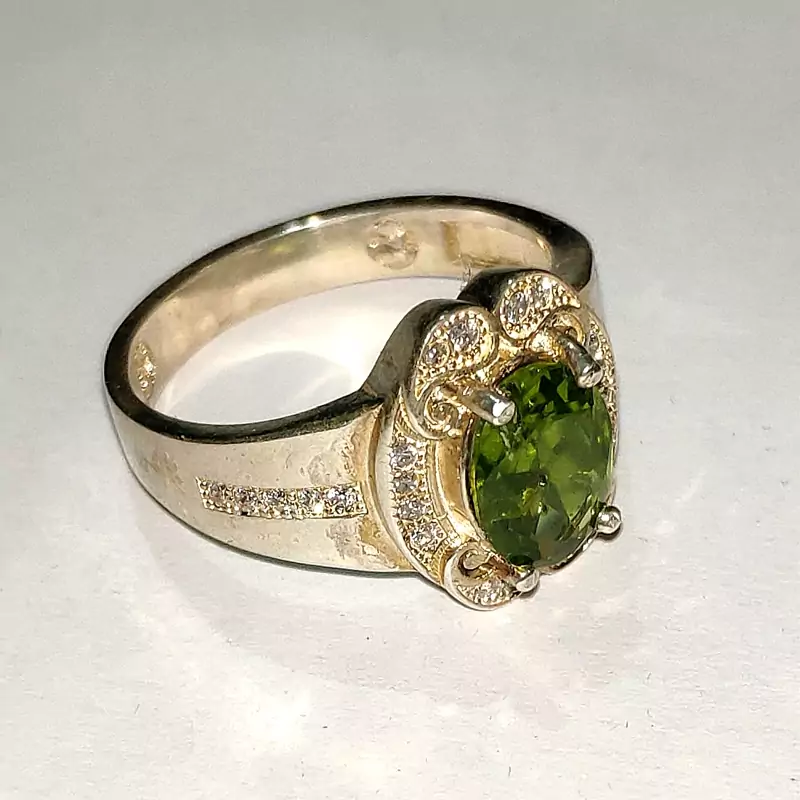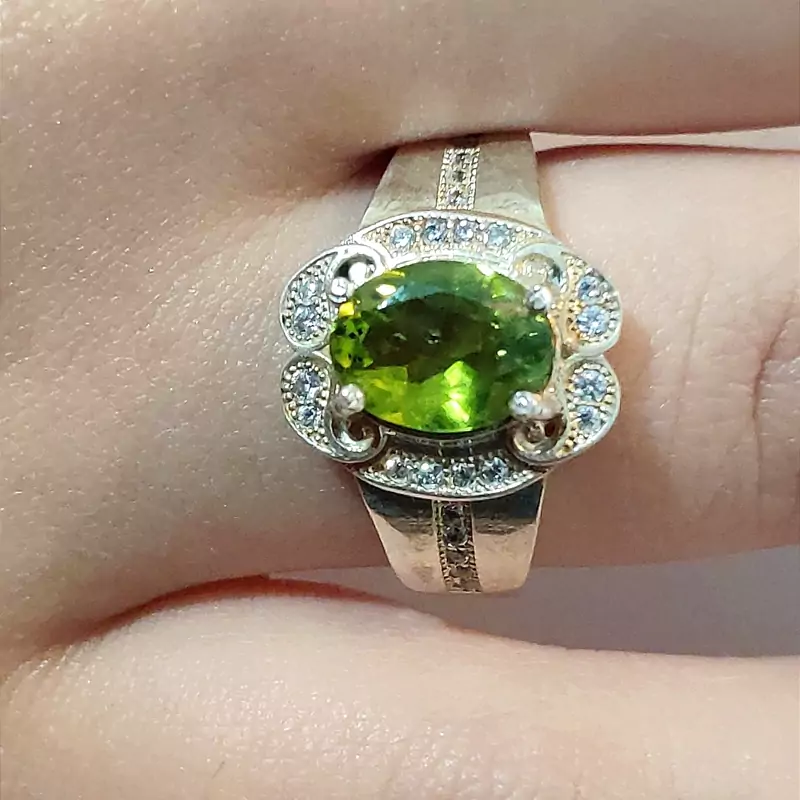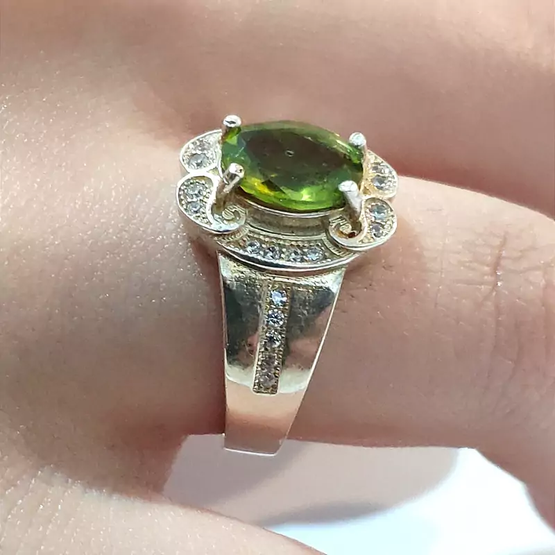 انگشتر زبرجد زنانه با رکاب نقره عیار بالا و مرصع شده با نگین های اتمی