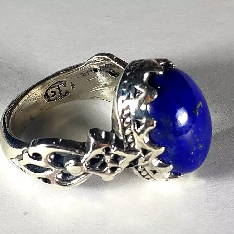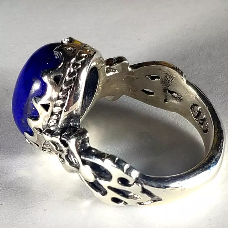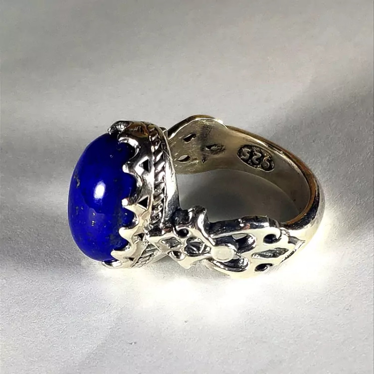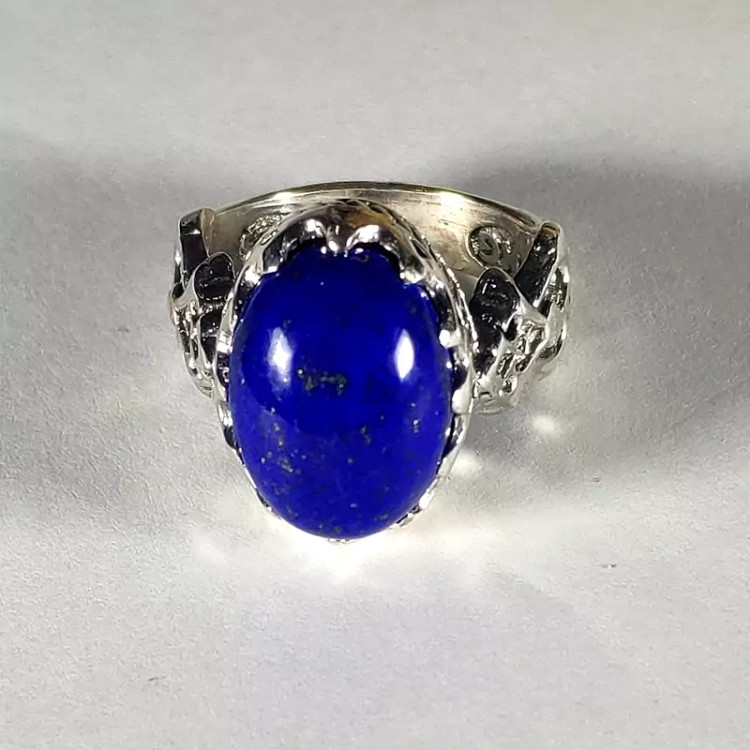 انگشتر لاجورد معدنی اصیل و بسیار خوش رنگ با تراش دامله و رکاب نقره عیار 925