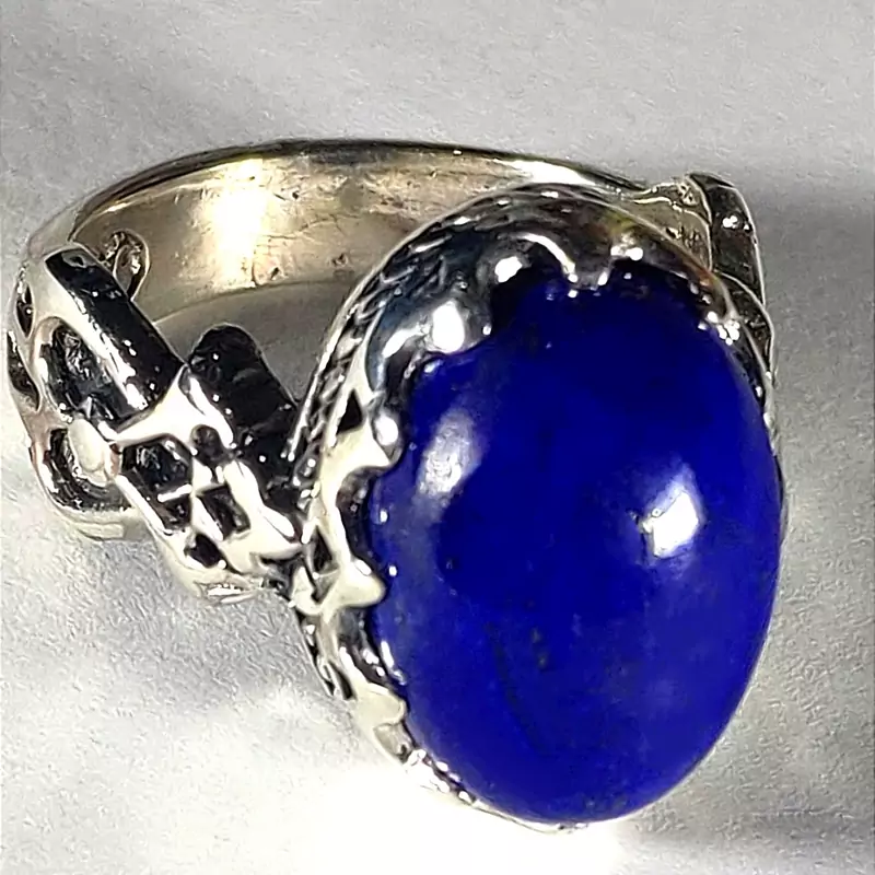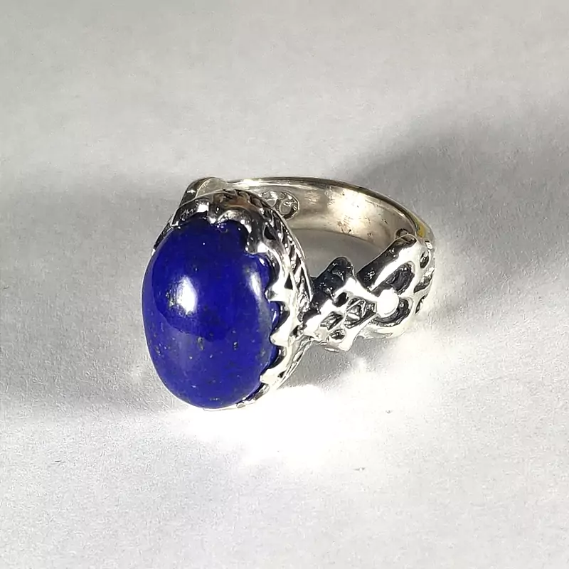 انگشتر لاجورد معدنی اصیل و بسیار خوش رنگ با تراش دامله و رکاب نقره عیار 925