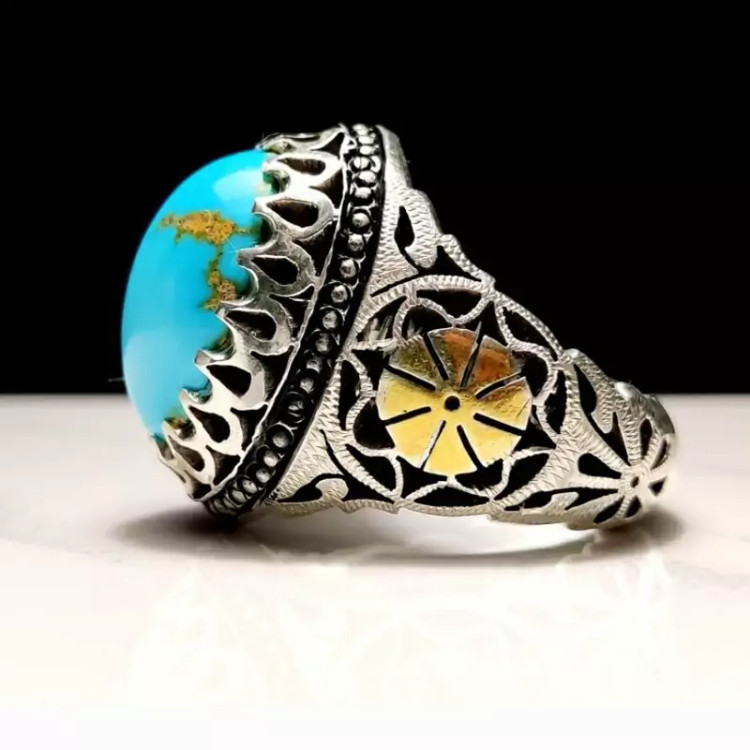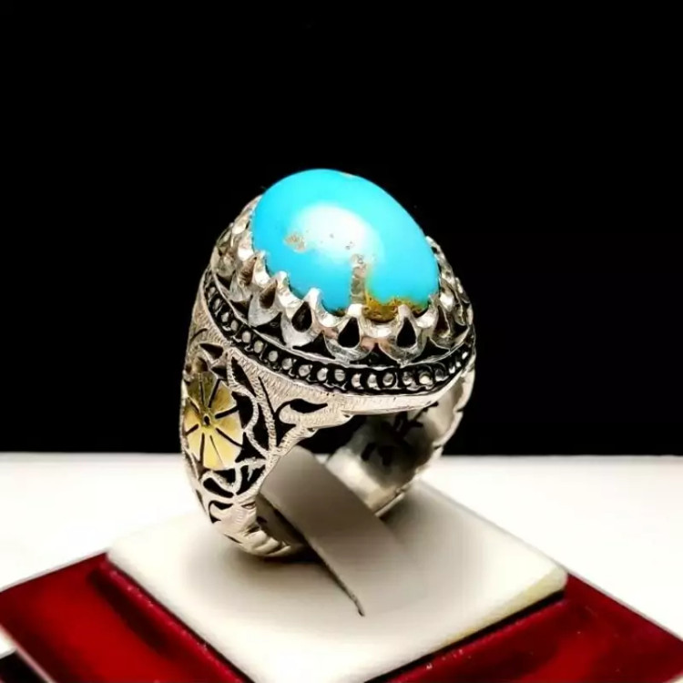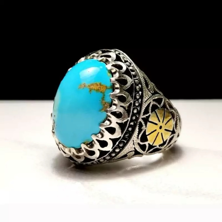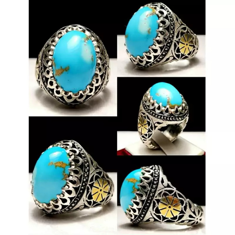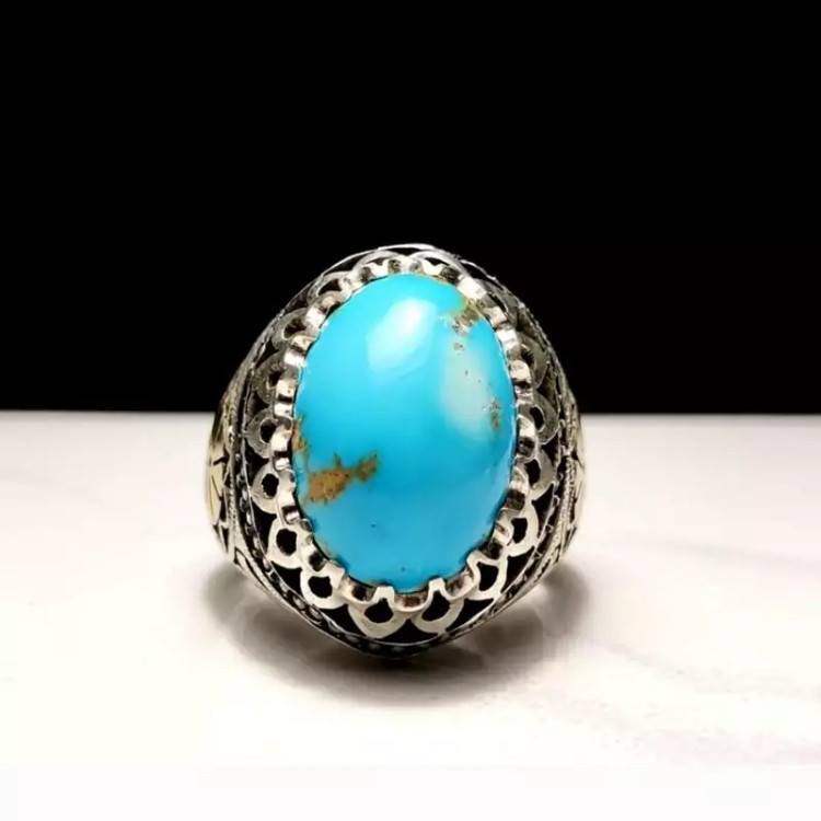 انگشتر فیروزه نیشابوری اعلا با رنگ آبی فوق محک و کاملاً طبیعی و رکاب دست ساز سفارشی