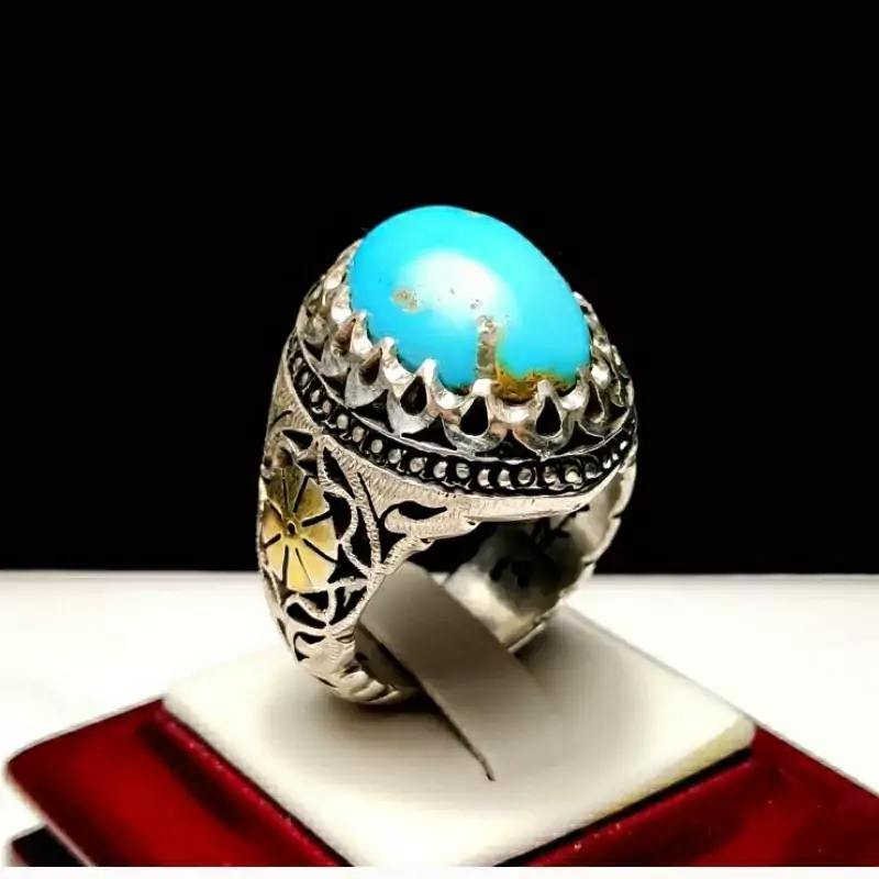 انگشتر فیروزه نیشابوری اعلا با رنگ آبی فوق محک و کاملاً طبیعی و رکاب دست ساز سفارشی