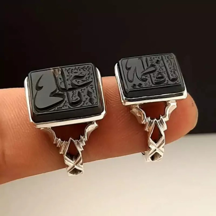دو عدد انگشتر عقیق جزع یمنی (ست زوج) ، با رکاب دست ساز عیار بالا و حکاکی دستی