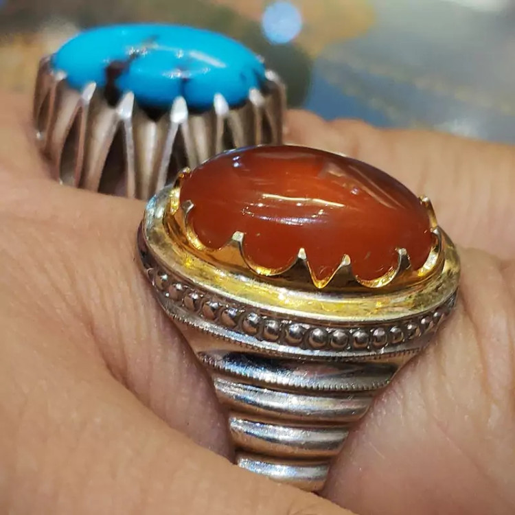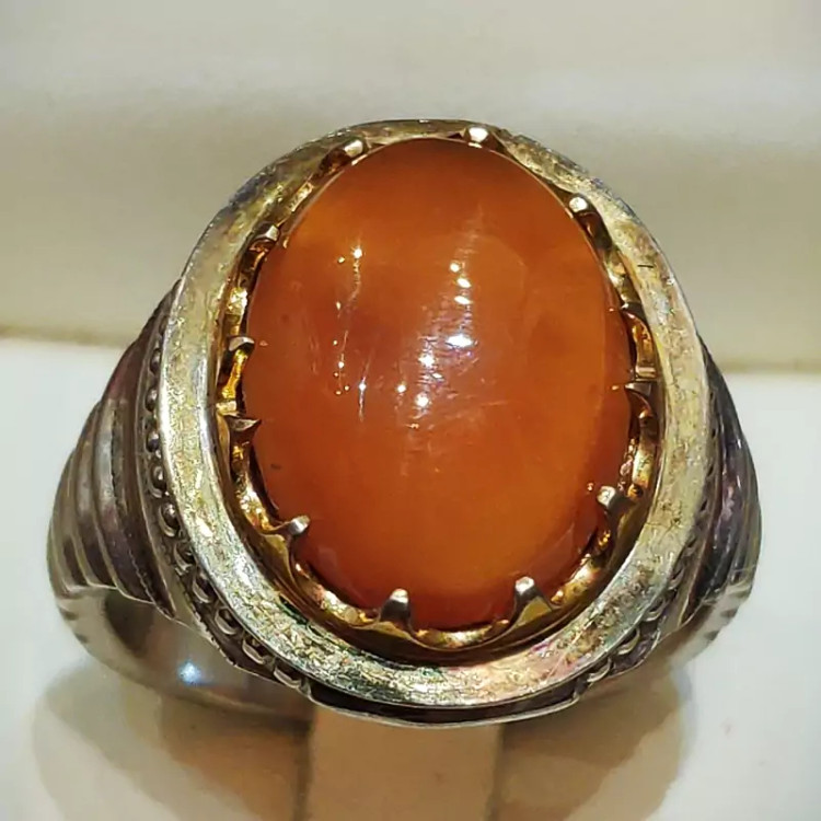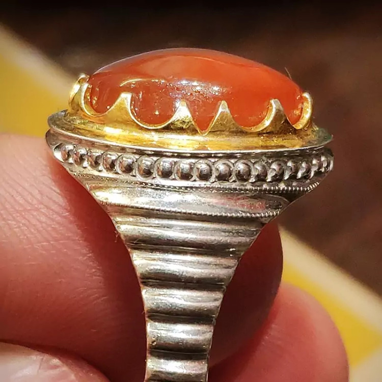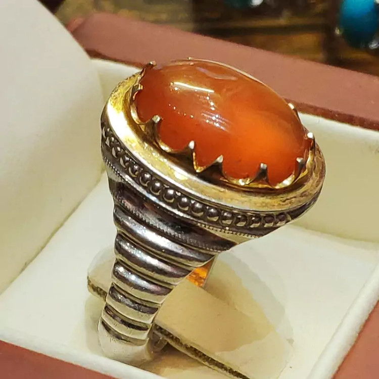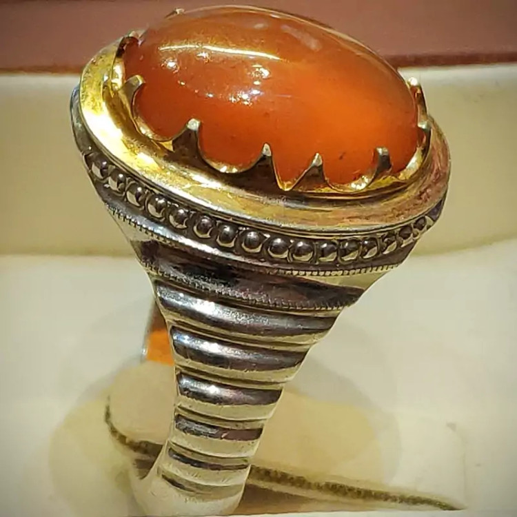 عقیق یمنی پرتقالی با کیفیت رنگ عالی و فوق العاده زیبا و رکاب دست ساز سفارشی مناسب برای آقا دامادهای شیک پوش و جذاب
