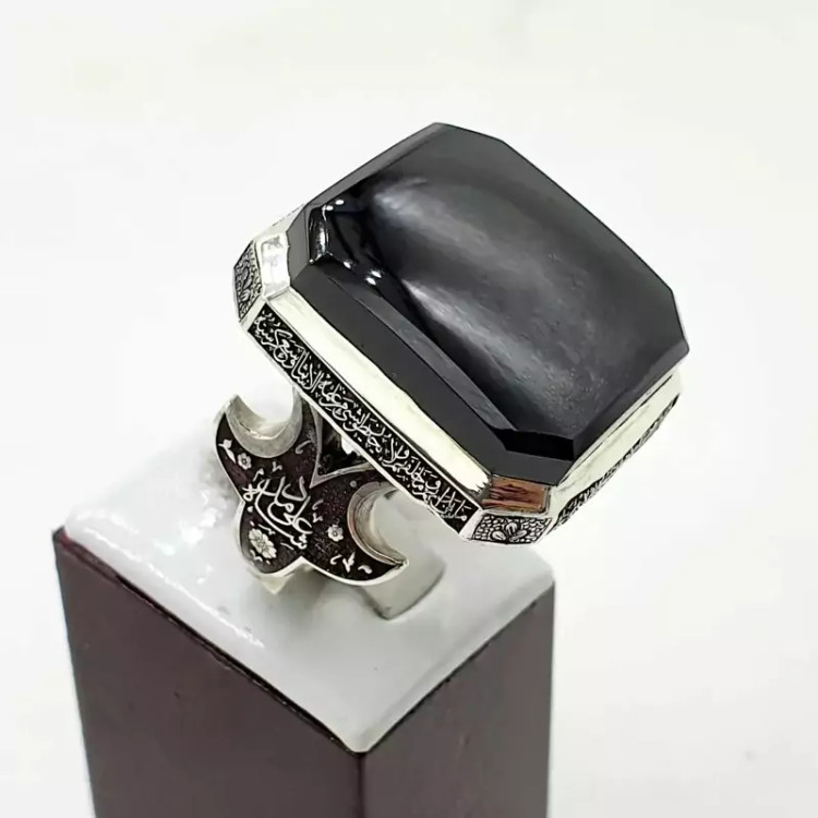انگشتر عقیق جزع یمنی اعلا با رکاب دست ساز سفارشی قلمکاری شده
