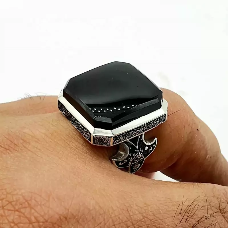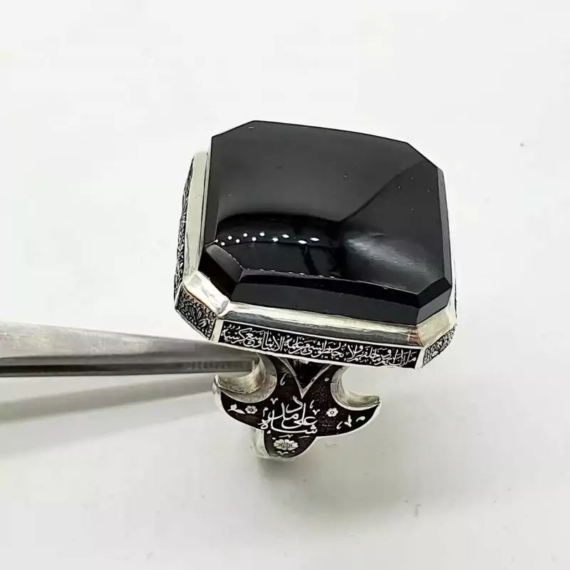 انگشتر عقیق جزع یمنی اعلا با رکاب دست ساز سفارشی قلمکاری شده