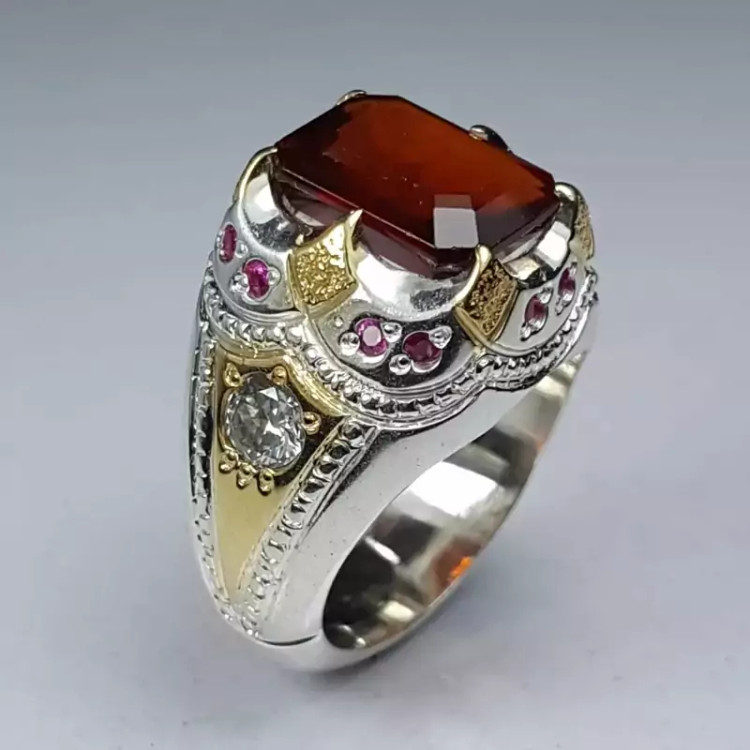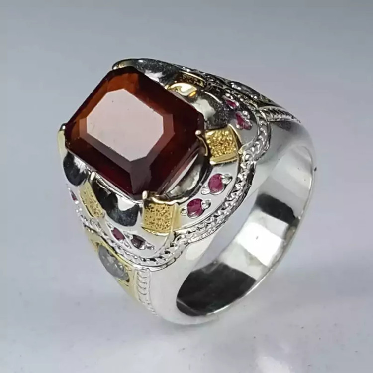 انگشتر گارنت سرخ آفریقایی تراش نگین چهار ضلعی مستطیل رکاب دست ساز سفارشی مدل سلطان شش کاسه بسیار خوشرنگ و زیبا ابعاد نگین 12 در 16 وزن نگین 8.۶۰ نگین های روی بازو موزینایت سفید{روسی اصل} نگینهای ریز مخراجی یاقوت سرخ اَتمی رکاب آبکاری شده برنگ طلایی سایز رکاب 61 عیار نقره 925 زمان ساخت سفارش و ارسال 15 روز تا 3 هفته