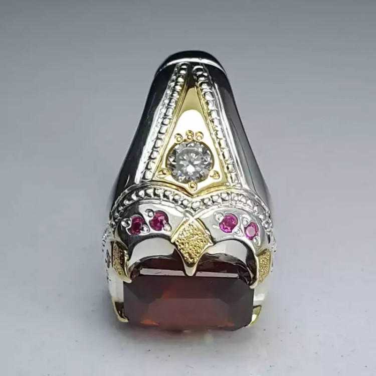انگشتر گارنت سرخ آفریقایی با رکاب دست ساز سفارشی و مخراجکاری شده با الماس روسی و یاقوت و برلیان اتمی
