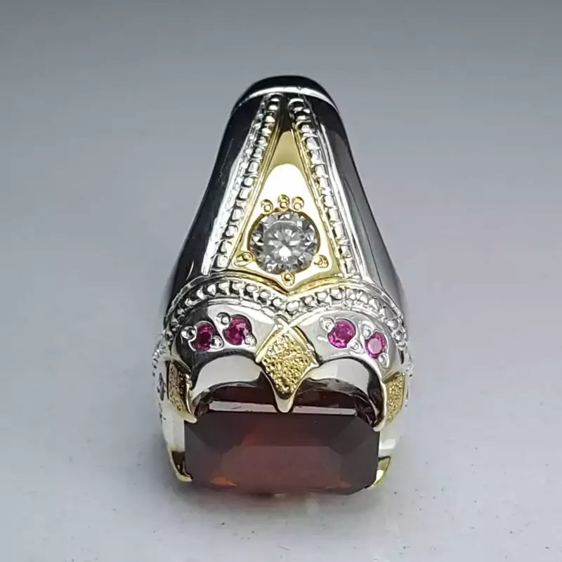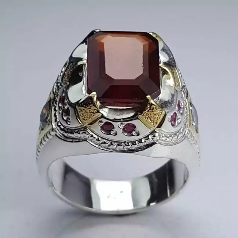 انگشتر گارنت سرخ آفریقایی تراش نگین چهار ضلعی مستطیل رکاب دست ساز سفارشی مدل سلطان شش کاسه بسیار خوشرنگ و زیبا ابعاد نگین 12 در 16 وزن نگین 8.۶۰ نگین های روی بازو موزینایت سفید{روسی اصل} نگینهای ریز مخراجی یاقوت سرخ اَتمی رکاب آبکاری شده برنگ طلایی سایز رکاب 61 عیار نقره 925 زمان ساخت سفارش و ارسال 15 روز تا 3 هفته