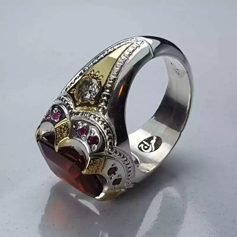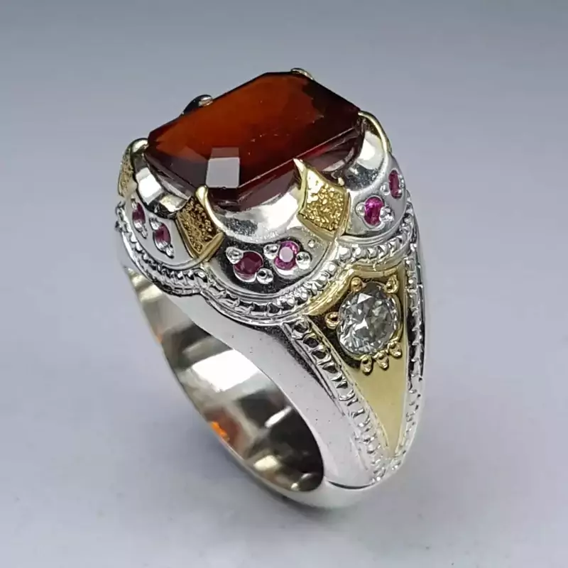 انگشتر گارنت سرخ آفریقایی با رکاب دست ساز سفارشی و مخراجکاری شده با الماس روسی و یاقوت و برلیان اتمی