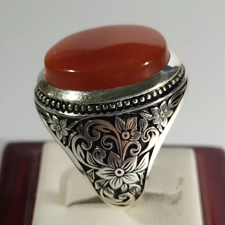 انگشتر عقیق سرخ یمنی اعلا با رکاب دست ساز سفارشی کلکسیونی و قلمکاری حرفه ای بسیار دقیق و منظم