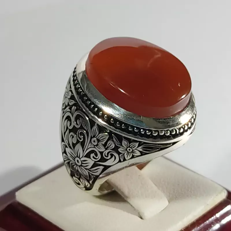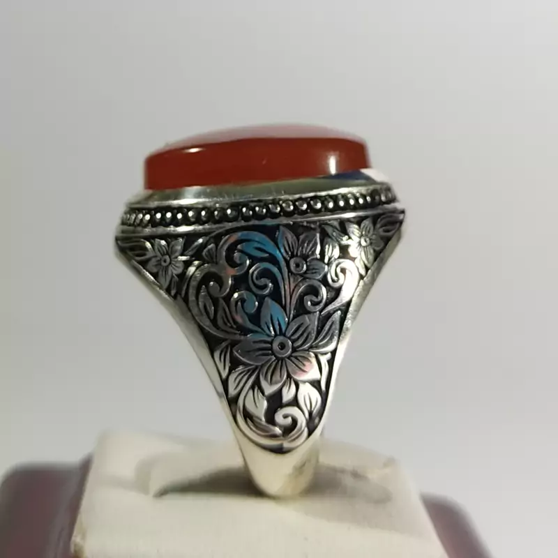 انگشتر عقیق سرخ یمنی اعلا با رکاب دست ساز سفارشی کلکسیونی و قلمکاری حرفه ای بسیار دقیق و منظم